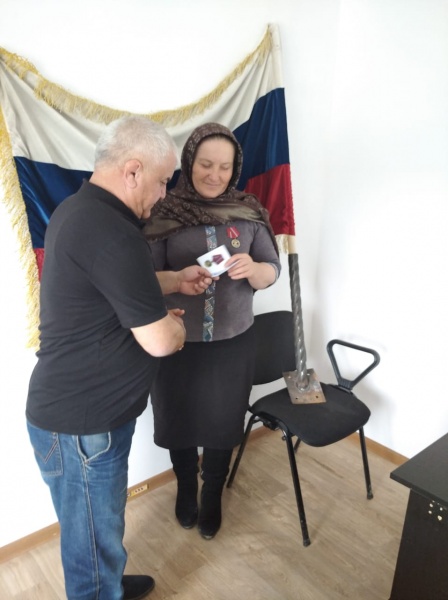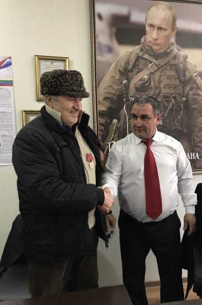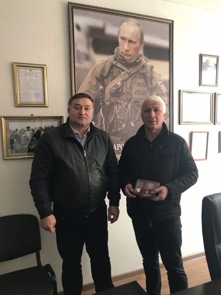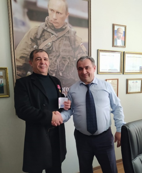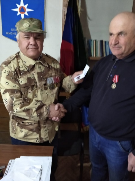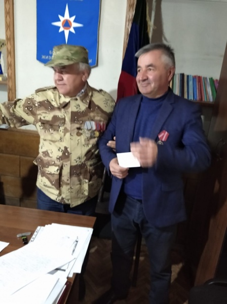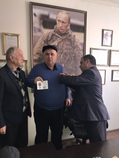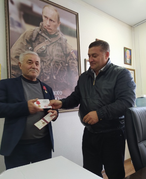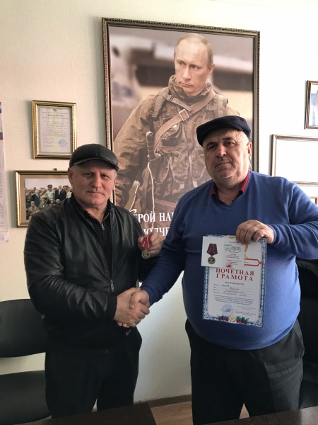 Медаль вручает командир Какашуринского ополчения Шайхов Мурад Хиясович
