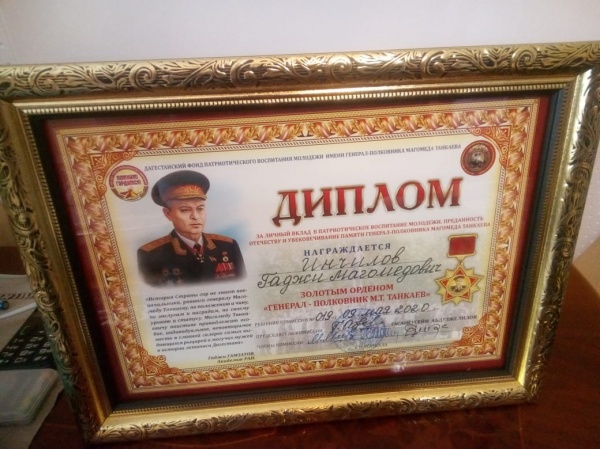 К ним прибавился и орден «Генерал-полковник Магомед Танкаев», учрежденный фондом его имени. Вручая ветерану заслуженную награду, Гасангусейн Абдулжелилов отметил: «Консолидированным решением Союза общественных объединений «Защитник Отечества» за большой вклад в патриотическое воспитание, преданность Отечеству и в честь 75-летия Победы мы ею отметили Вас, дорогой Гаджи Магомедович. Вы на полях сражений в Великой Отечественной войне совершили беспримерный подвиг и героизм. Низкий поклон Вам за Вашу ратную службу, личный вклад в дело разгрома немецко-фашистских захватчиков.